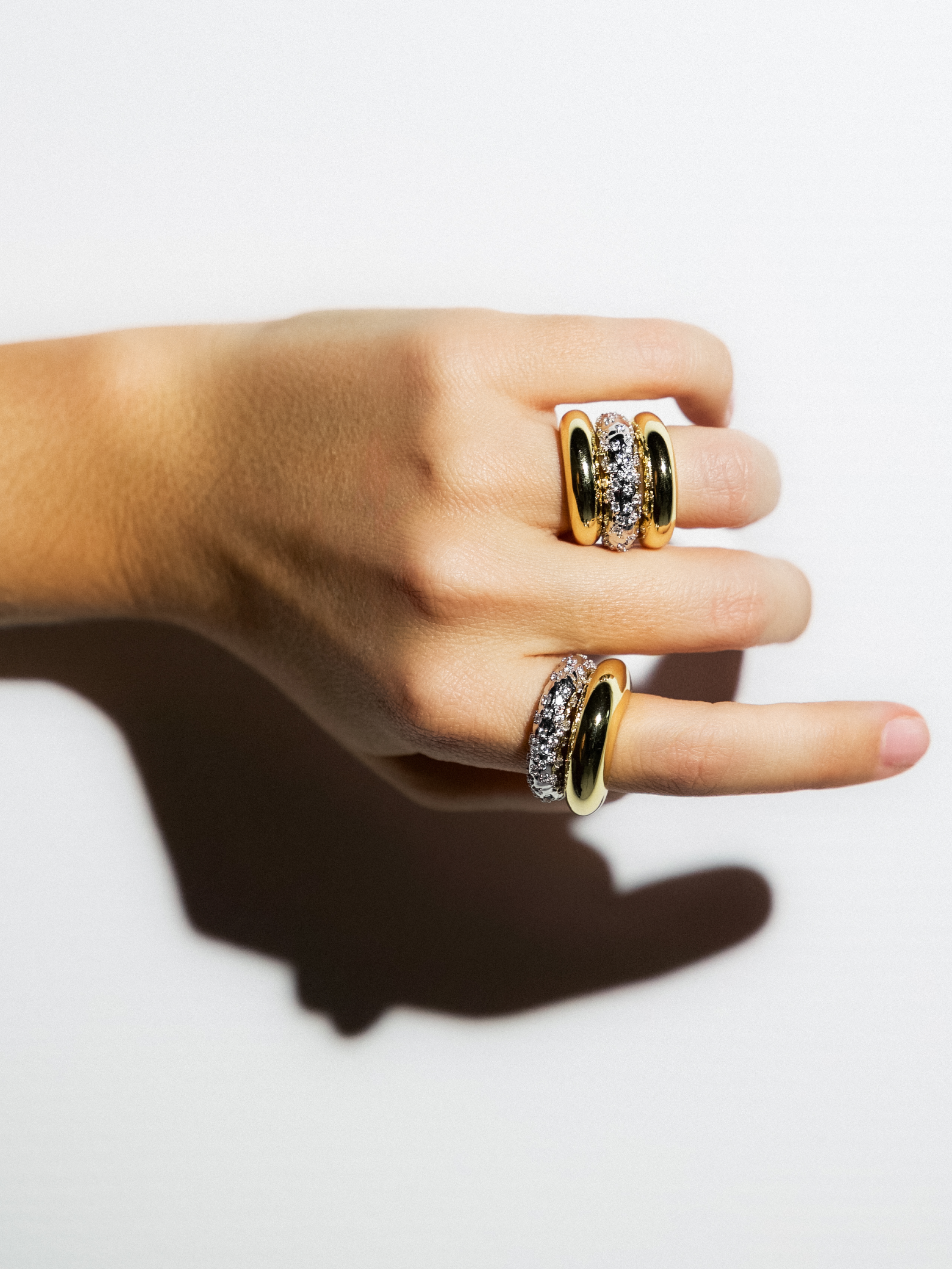This set features two rings: one crafted in sterling silver adorned with crystals, and the other in a sleek gold-tone finish. Both are designed with a solid silver core for durability and a discreetly engraved logo on the inside.