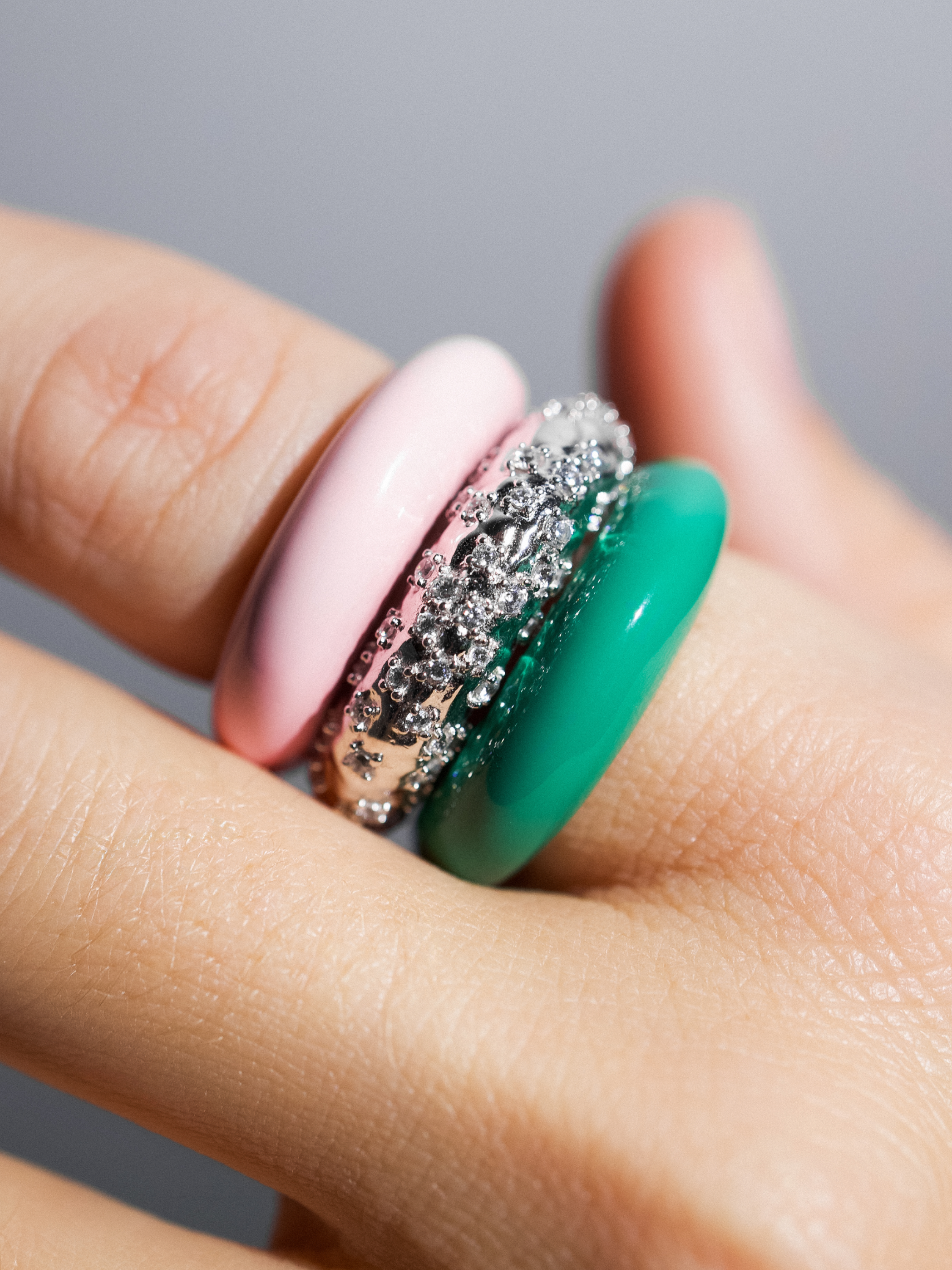 Two rings that are just perfect together - one with pink enamel, the other with a subtle bit of sparkle.